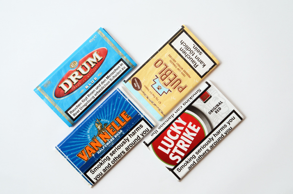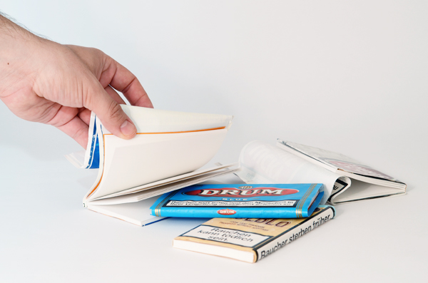 A series of hand made, stitched sketchbooks made with empty tobacco bags.